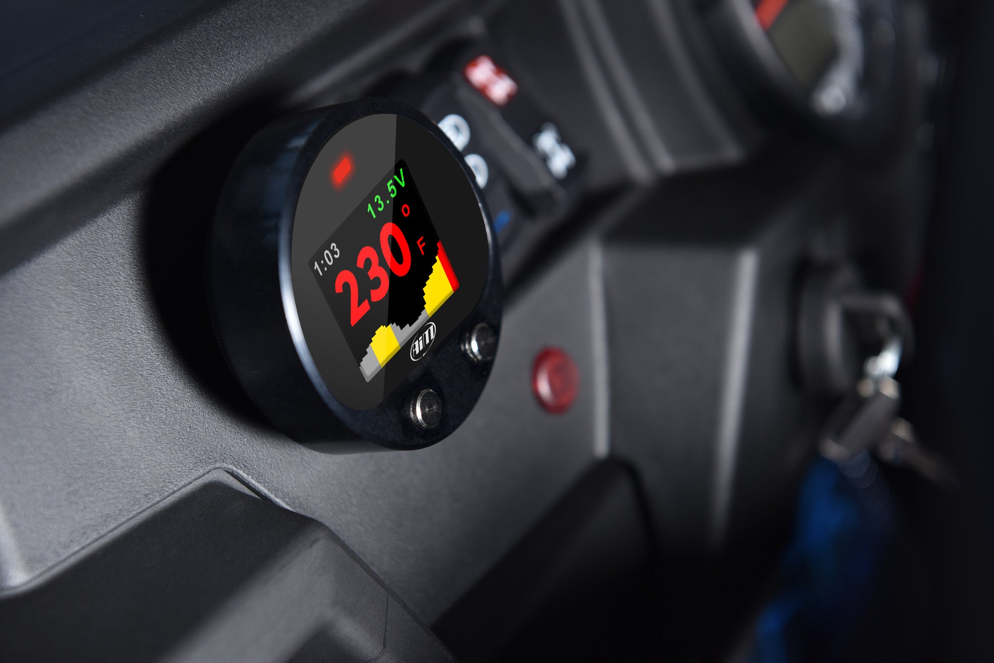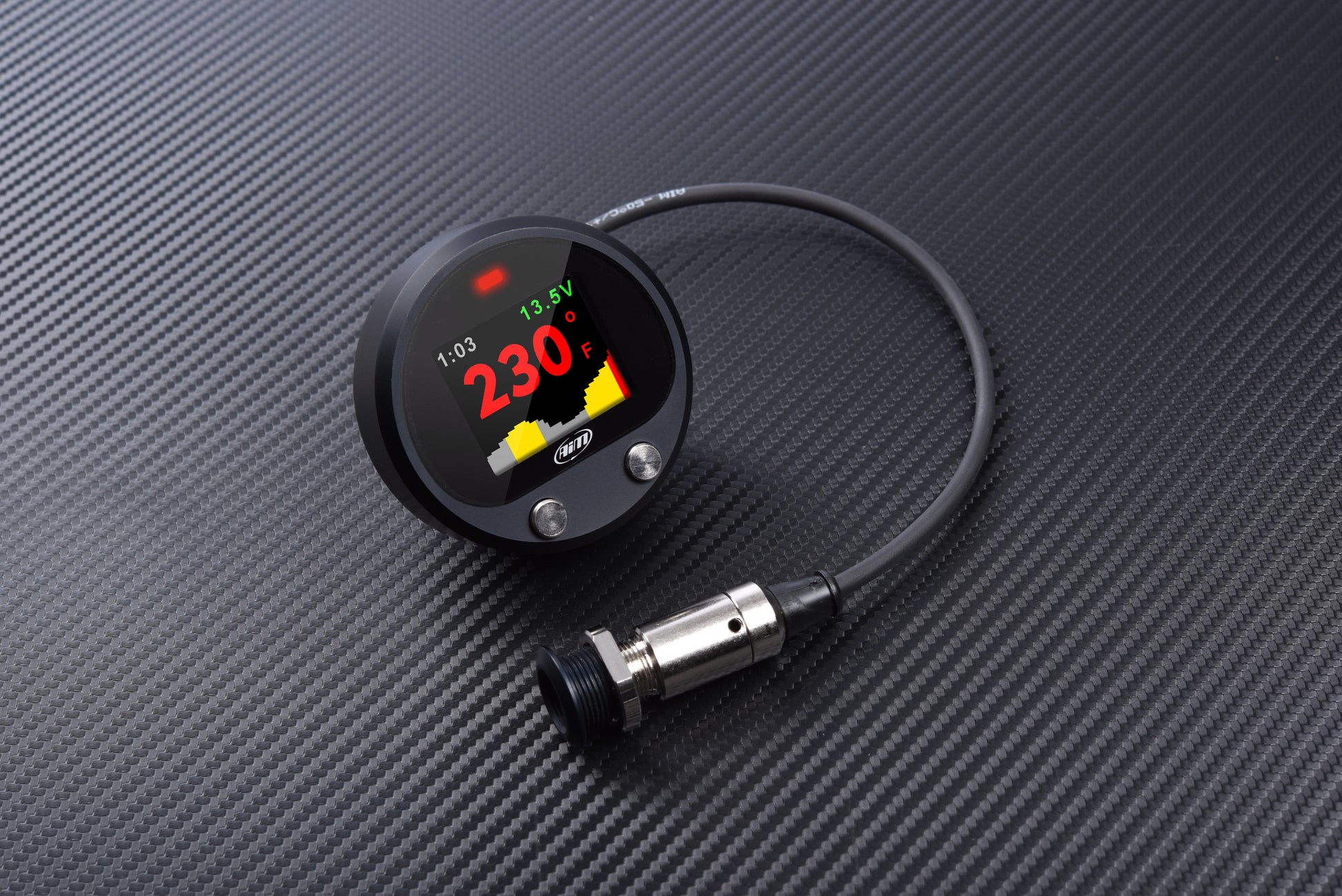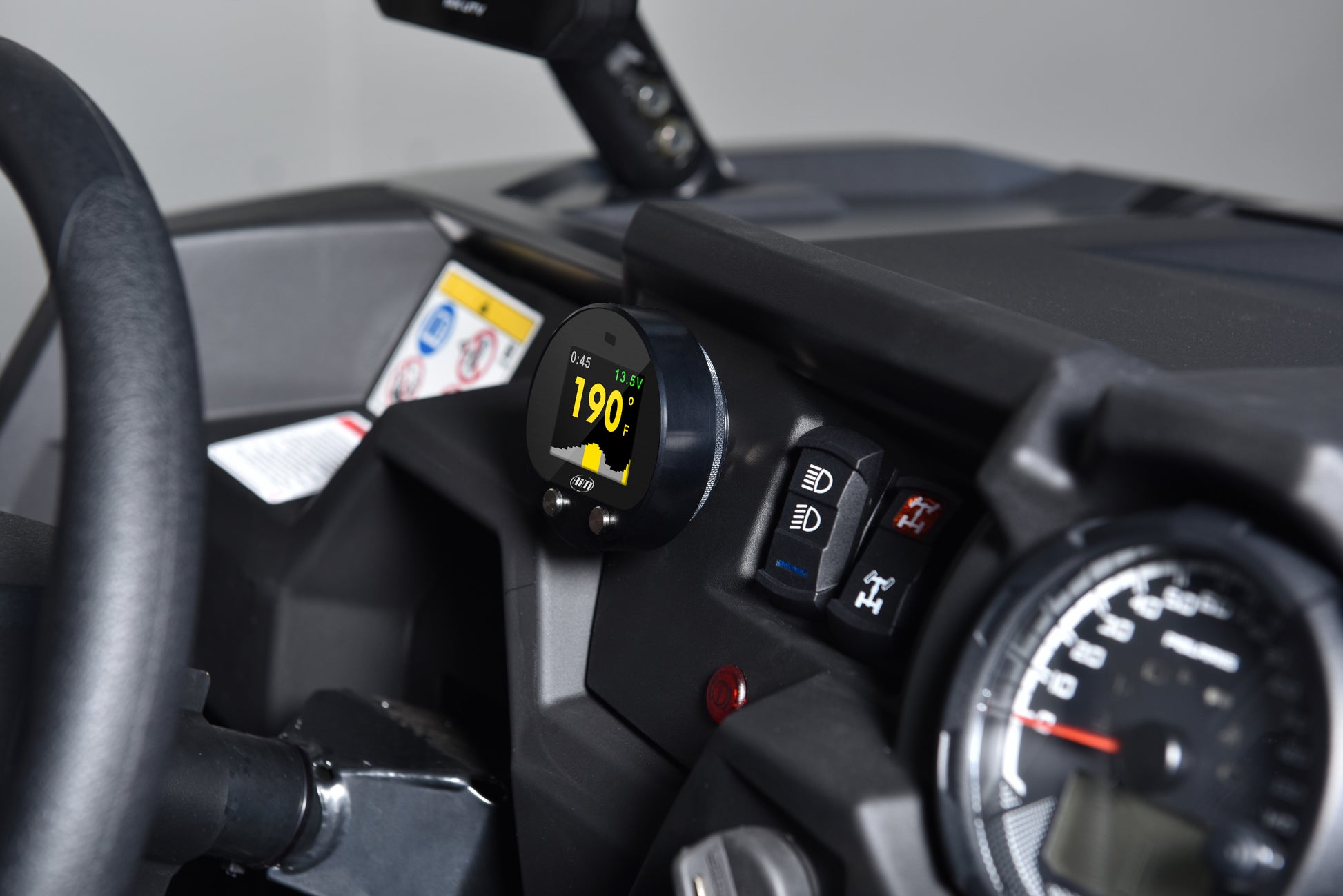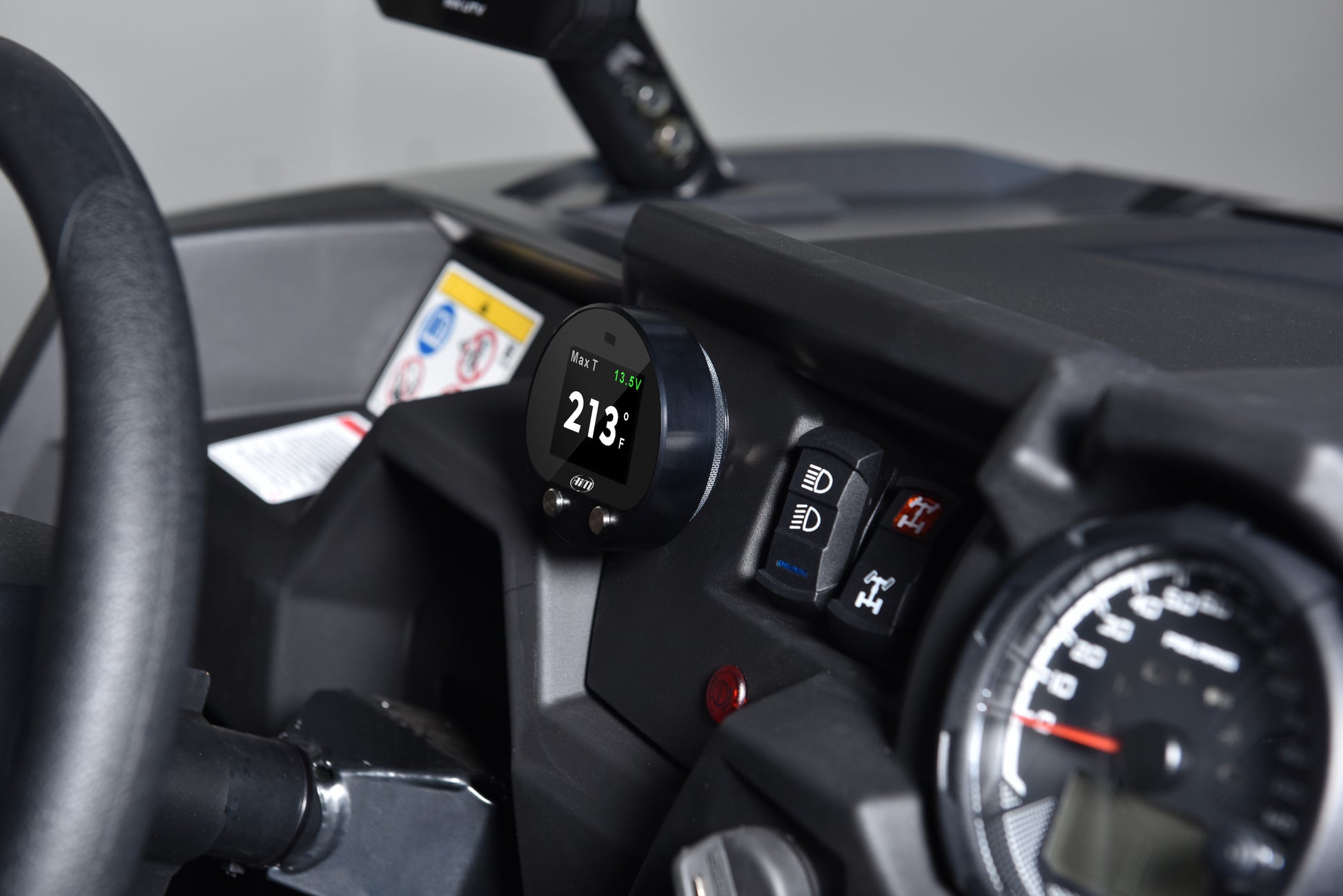 Due to anything you can find on an off-road circuit, UTV Racing is such a demanding activity which does really stress every component of your vehicle. Without any doubt, the transmission belt is one of those and if it should reach critical temperatures of exercise without being kept under control, it could even break down and let you out of the race. This is the reason why AiM designed the Infrared Belt Temperature System: a simple and reliable way for monitoring the temperature of the transmission belt of your UTV. The kit is composed by a gauge and an infrared sensor. Reliable, easy to install, perfectly visible in every light condition, it has been designed for working in a hard environment.
